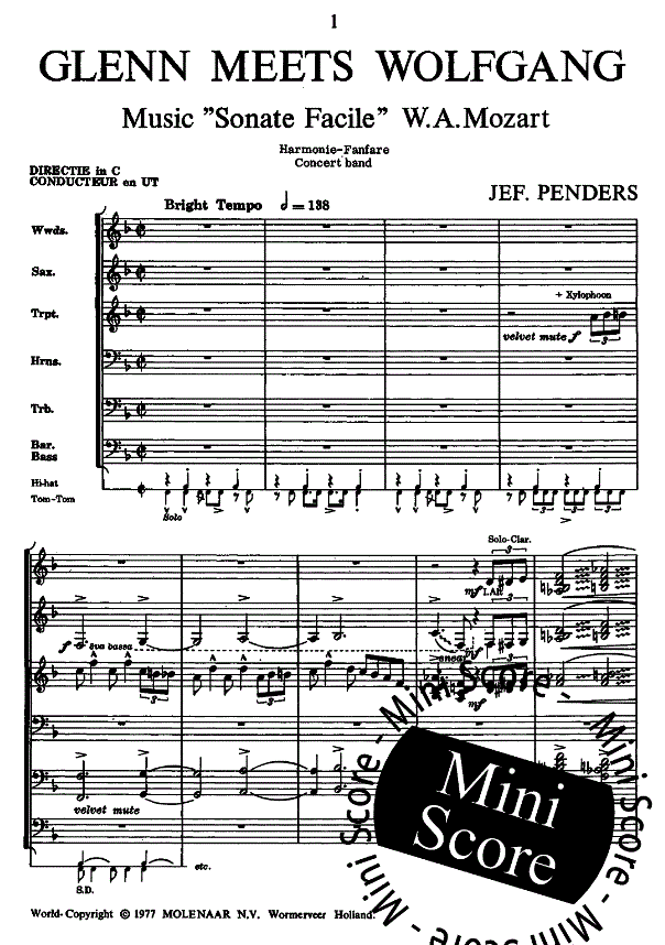 Additional info/contents JEF PENDERS ist ein sehr bekannter niederländischer Komponist von Blasmusik. Er ist auch immer sehr aktiv gewesen als Dirigent, Arrangeur und Aufnahmeleiter. In seinem Stück "Glenn meets Wolfgang" (1969) verarbeitete er Mozarts 'Sonate Facile' in dem populären Glenn Miller Stil.