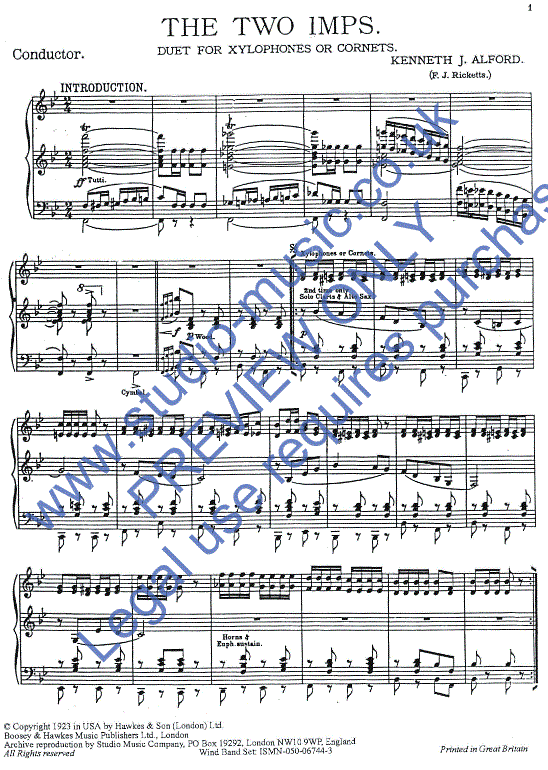 Additional info/contents "Two Imps" by Kenneth J. Alford is a brilliant and entertaining composition suitable for both xylophone and cornet soloists. The piece shows a different side of Alford to his famous marches and highlights his ability to write humorous and technically demanding music. "Two Imps" remains a staple in the wind orchestra and brass band repertoire and delights musicians and listeners alike with its bubbly character and the virtuoso demands on the soloists.