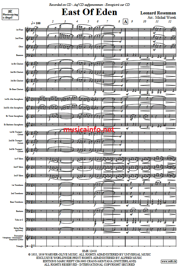 Additional info/contents Leonard Rosenmann's score for "East of Eden" conveys the film's emotional depth through a variety of timbres. Michal Worek has arranged it for intermediate wind orchestras, simplifying the music while retaining its mood and impact. This allows wind orchestras to effectively convey the film's atmosphere.