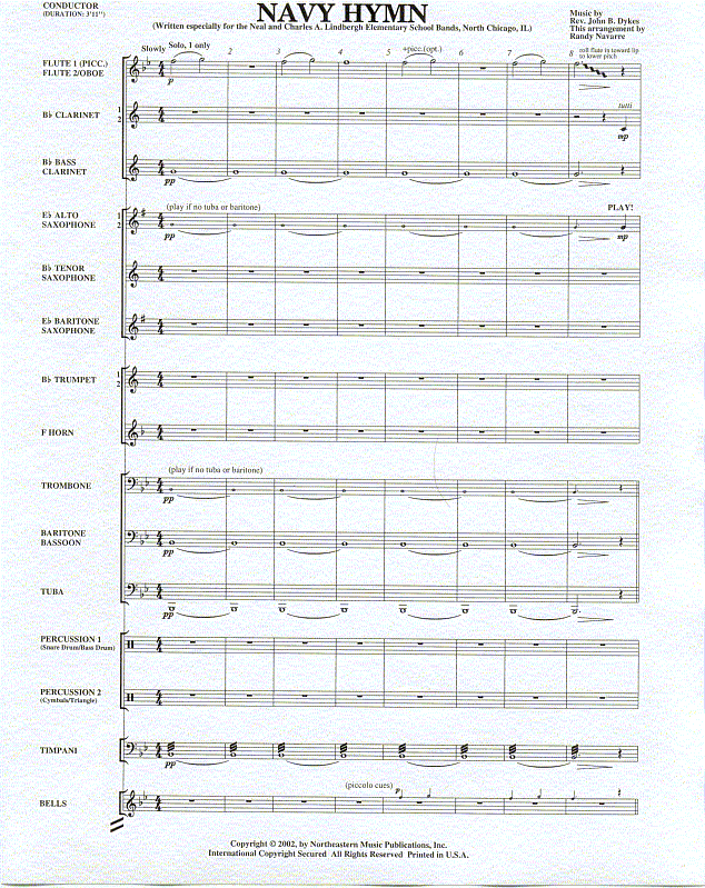 Additional info/contents An easy arrangement of this beautiful hymn for the United States Navy. Add this patriotic tune to your young band concert. The 1st clarinets cross the break and the 1st trumpet's highest note is D.