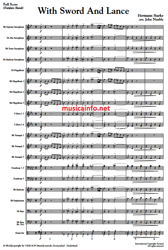 Additional info/contents With Sword And Lancee is the march that awarded Hermann Starke (1870-1920) the 1st Prize of the 1912 International Contest, but is also his claim to fame. Starke wrote many pieces for band that all seemed to be forgotten; this march however is the exception to the rule. John Nimbly transcribed this piece and added all missing but nowadays necessary parts. The original instrumentation is left completely intact.