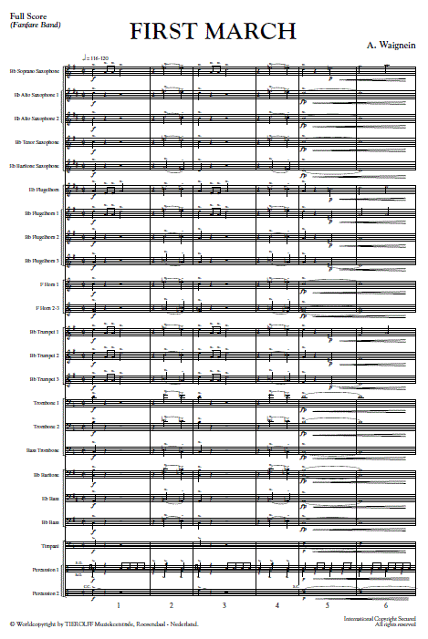 Additional info/contents André Waignein wrote this First March by request of André Porte, the conductor of the Harmonie of Moorslede (Belgium). It’s a lively march which highlights the specific sound of the wind band. In short, a nice moving march.