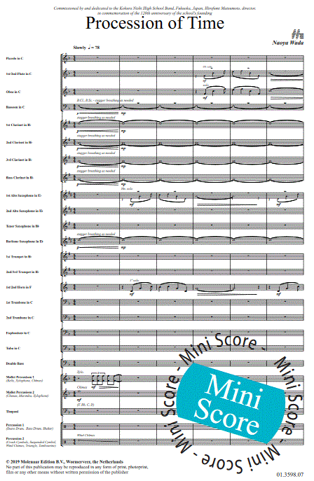 Additional info/contents Procession of Time was composed to commemorate 120th anniversary of foundation of the Kokura Nishi High School, located Fukuoka, Japan. The piece opens with a slower dramatic introduction. The simple but impressive melody is repeated in several forms throughout the piece. This emotional and energetic composition is to be a great choice for all concerts and contests.