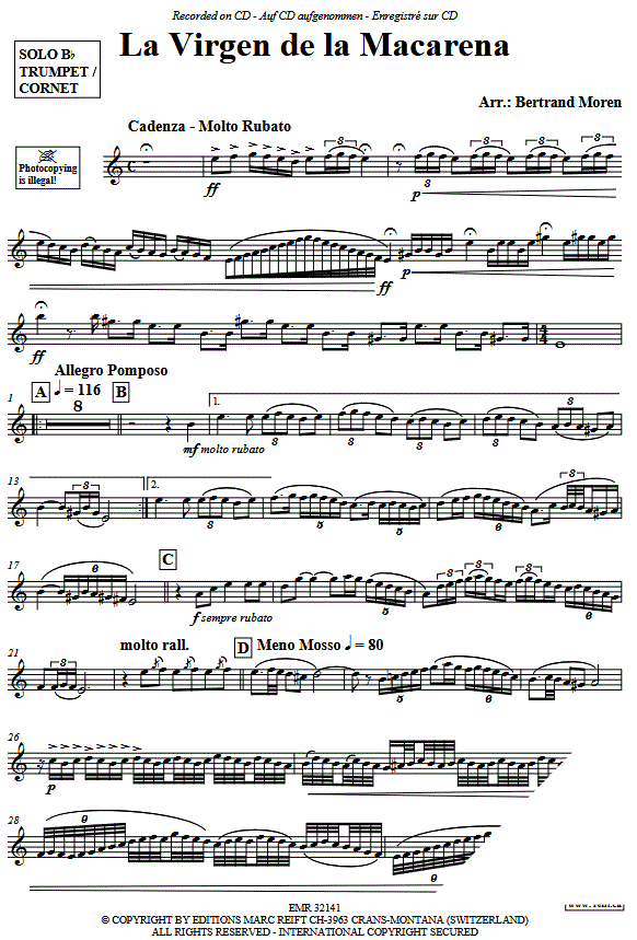 Additional info/contents Bertrand Moren's arrangement of "La Virgen de la Macarena" is a prime example of the successful combination of tradition and modernity. It preserves the essence of the original while enriching it with technical sophistication and tonal versatility. For soloists and ensembles alike, the work represents an opportunity to present stirring music with cultural depth.
