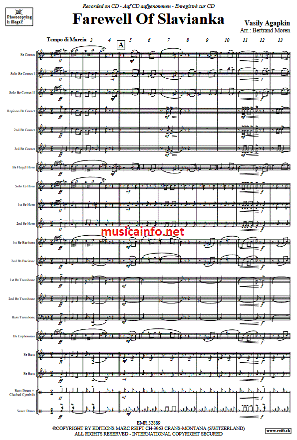 Additional info/contents The combination of Agapkin's timeless melody and Moren's imaginative arrangement makes "Farewell of Slavianka" an outstanding work for intermediate wind orchestras and brass bands. The composition remains a living testament to the power of music to connect historical and emotional dimensions, offering a moving experience for musicians and listeners alike.
