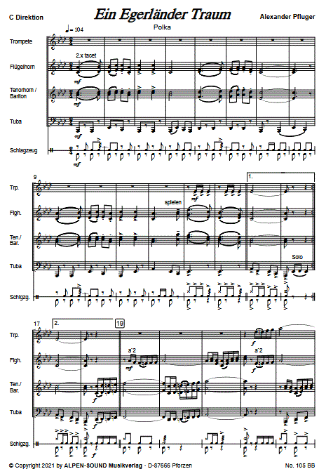 Additional info/contents "Ein Egerländer Traum" is a multifaceted polka written by Alexander Pfluger. With this composition, Pfluger expresses his love for Egerländer brass band music. Every bar reflects the passion and dedication he feels for this music. The polka combines classic Egerländer stylistics with Pfluger's unique style, capturing the fascination and diversity of brass band music in an incomparable way.