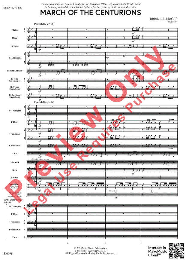 Additional info/contents The powerful group of Roman centurions process into the hall in perfect formation. Their collective movement is punctuated with bold melodic statements, a military-style cadence, and layered rhythmic and countermelodic elements. Brian Balmages has included optional antiphonal brass parts, perfect to include local high school or college students. March of the Centurions promises to be a jaw-dropping performance event!