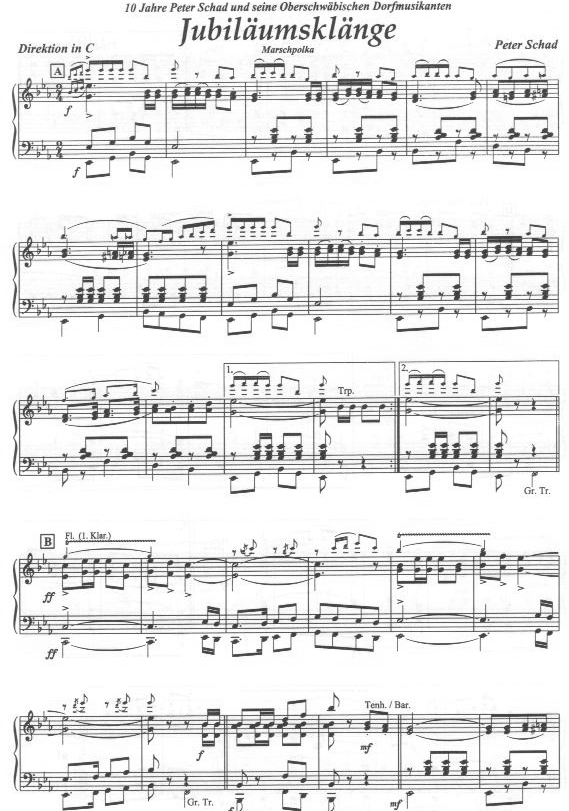 Additional info/contents The Marsch-Polka Jubiläumsklänge was created in 1993 on the occasion of the 10th anniversary of the "Oberschwäbische Dorfmusikanten". Since then it has been one of the most successful pieces by Peter Schad.