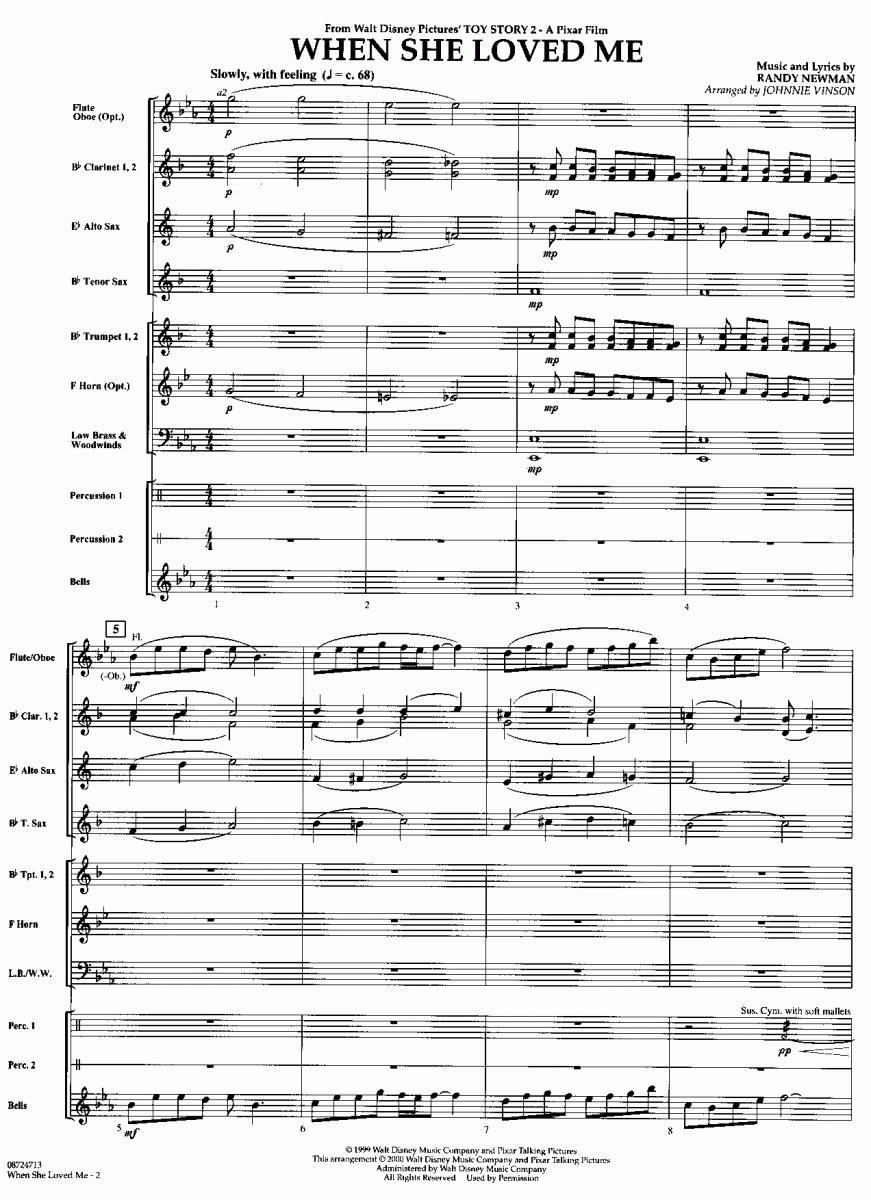 Additional info/contents This is an easy arrangement for young concert of the beautiful ballad, "When She Loved Me" from the Walt Disney motion picture "Toy Story 2". It should be especially useful for teaching "legato" style.